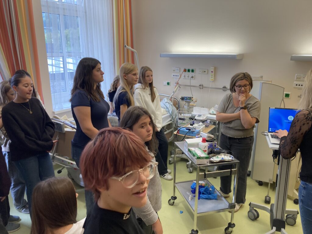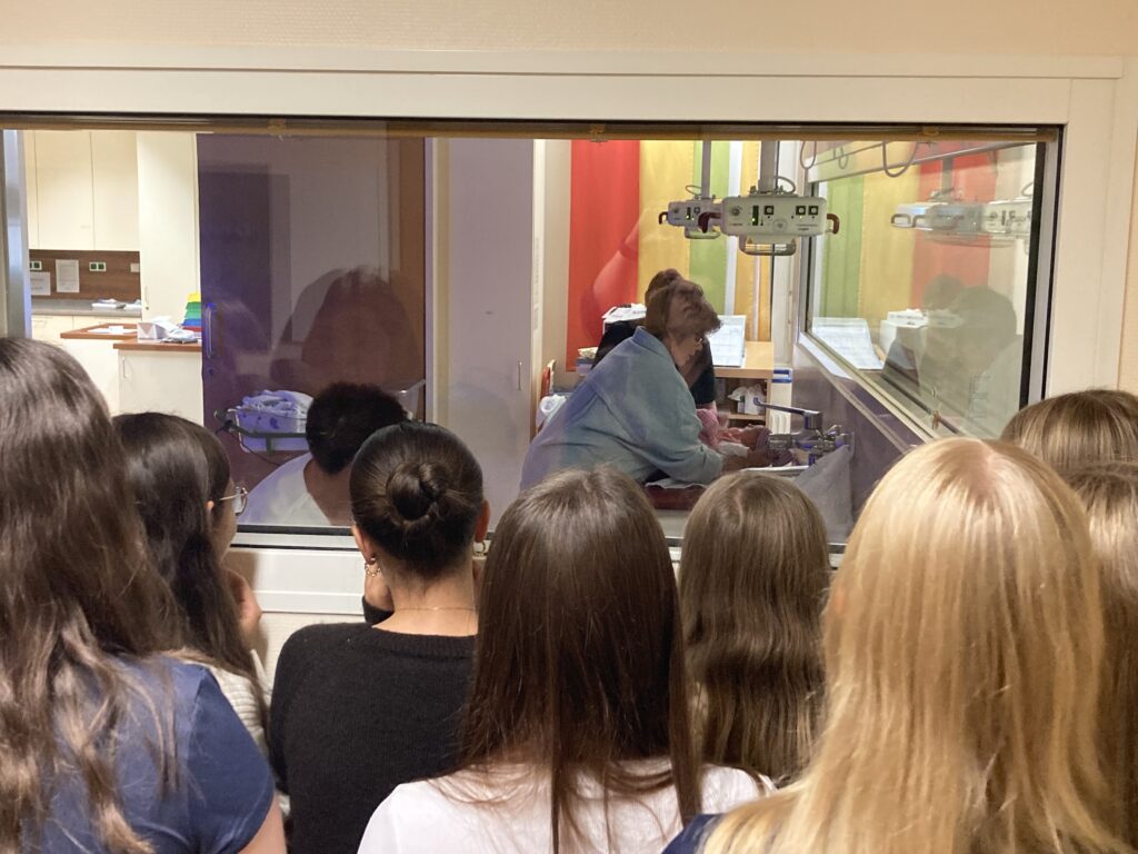 Weiter gings, wo sie von Frau Alexandra Wieseneder in die Aufgaben der Geburtenabteilung eingeweiht wurden und fasziniert beim Bad eines Neugeborenen zusehen durften.