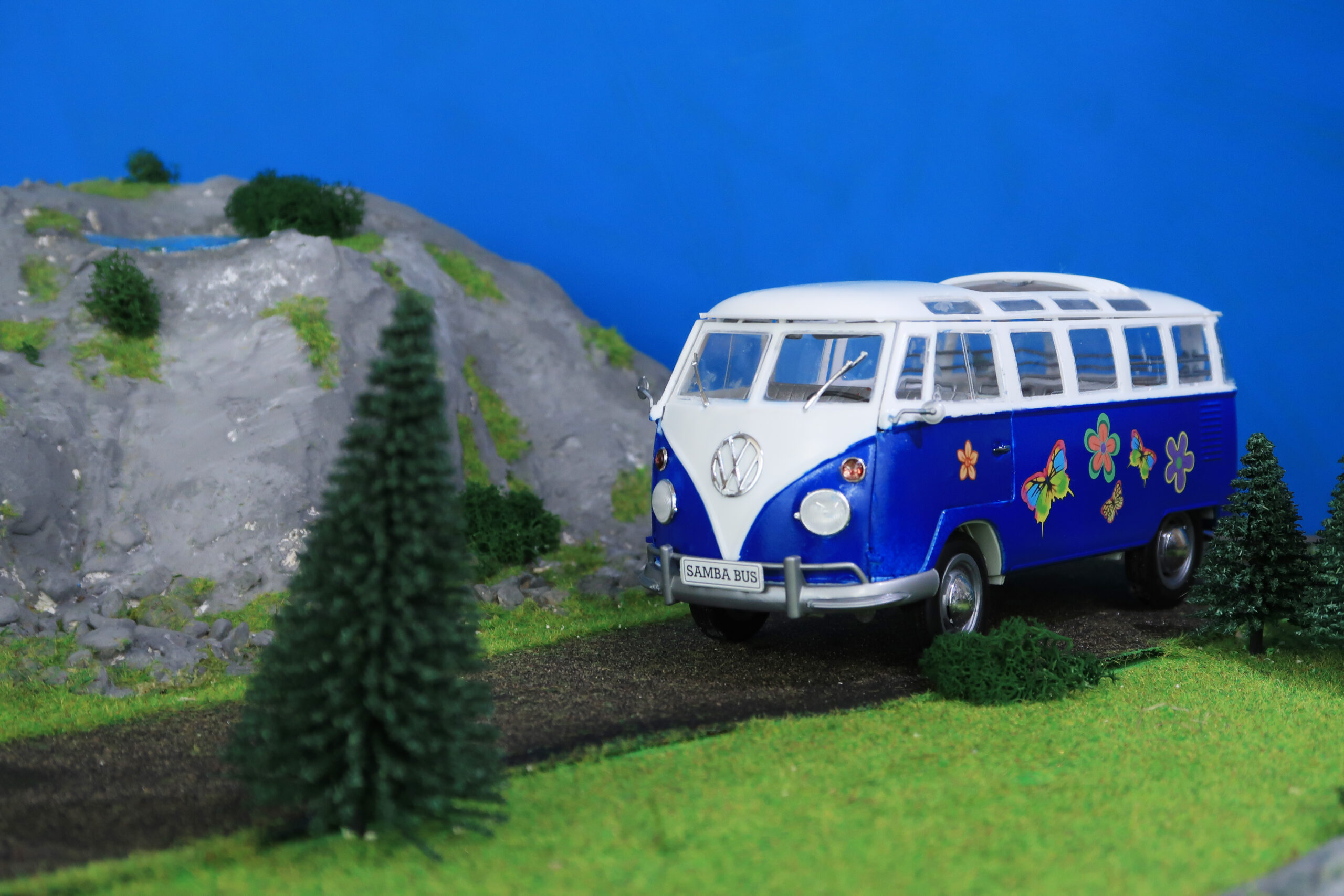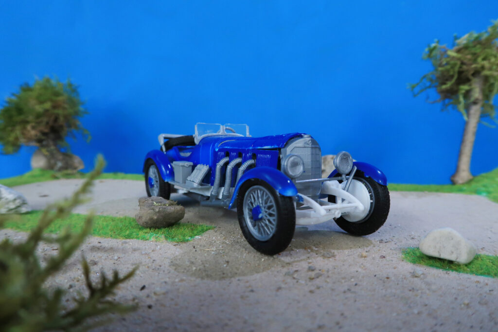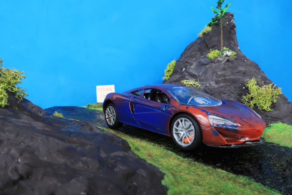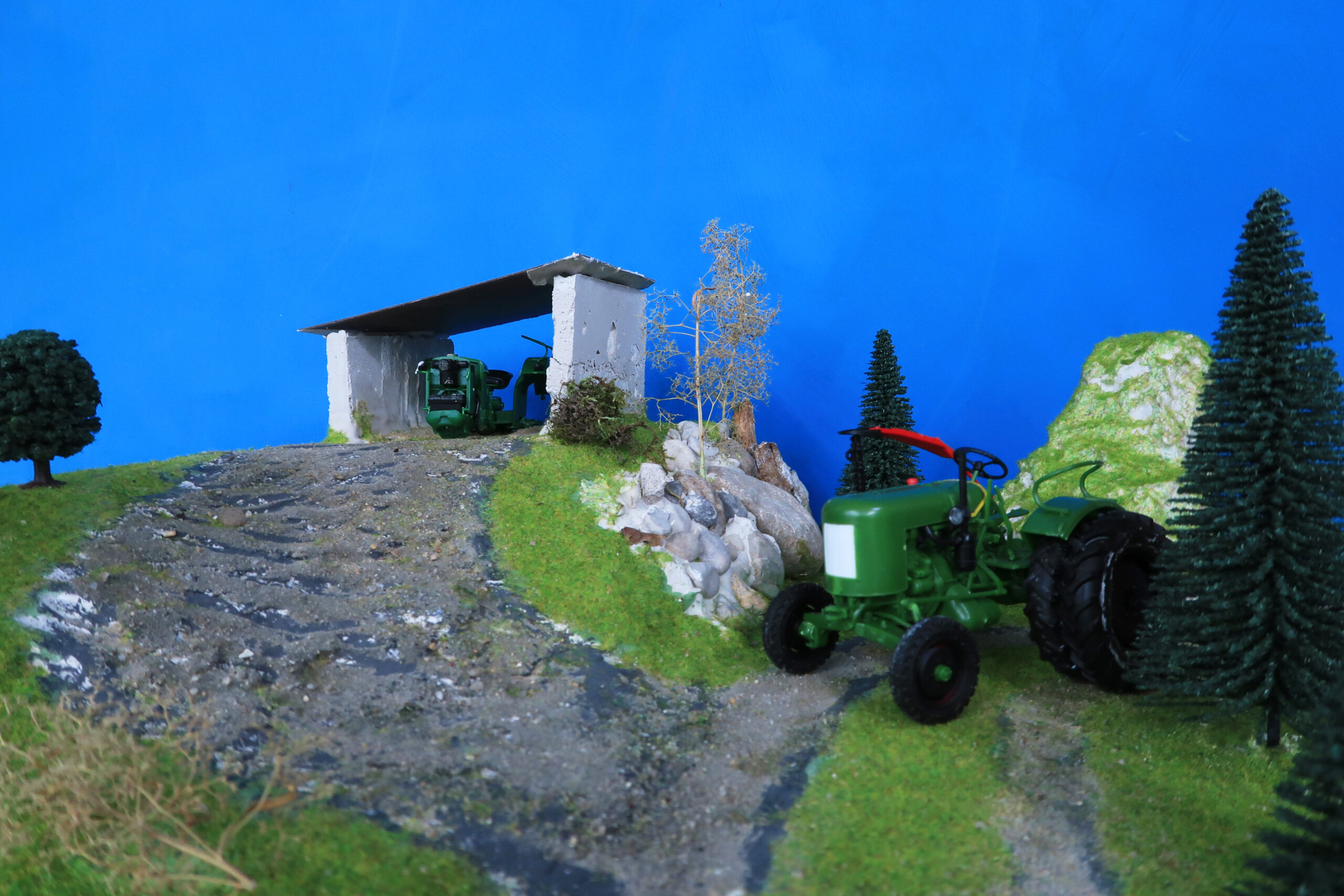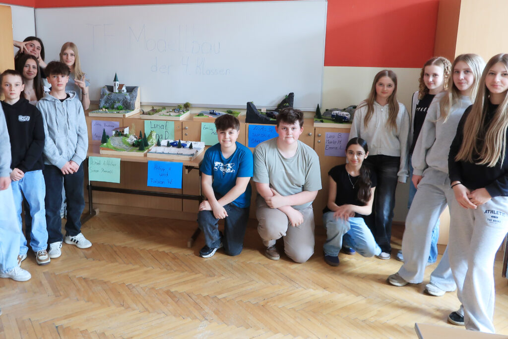 Die teilnehmenden Schülerinnen und Schüler der 4ab bauten Kunststoffmodelle von Fahrzeugen und Gebäuden, die sie dann in eine speziell dafür angefertigte Landschaft aus Holz und Spachtelmasse einfügten. Ausgestaltet wurden diese Landschaften mit Gras, Büschen, Bäumen, Felsen sowie Wasserfolie.